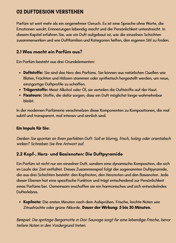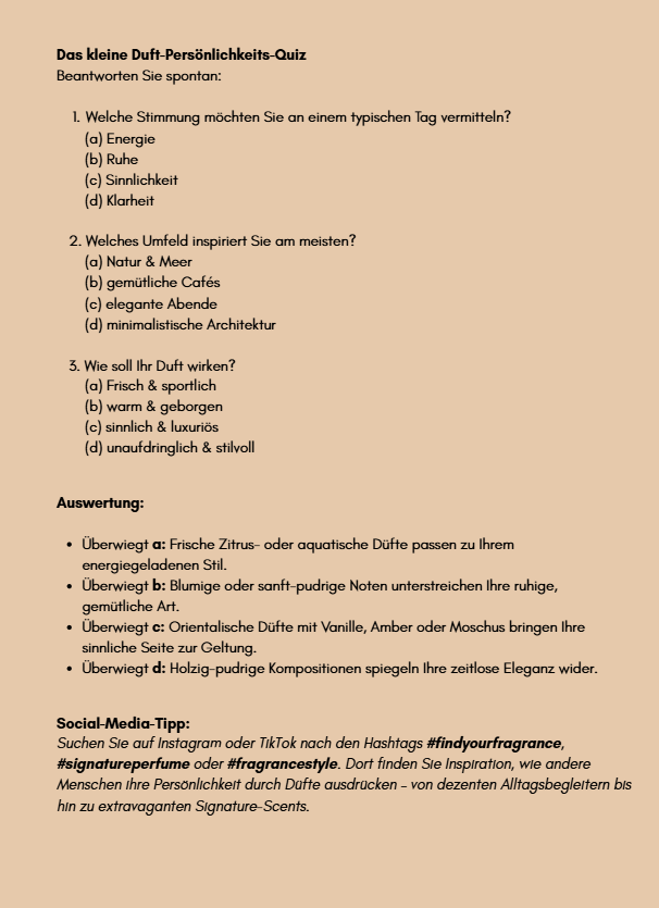 Die enthaltenen Duft-Quizzes helfen, persönliche Präferenzen zu erkennen und das eigene Duftprofil zu schärfen. Der Scent Guide ist als digitaler Leitfaden (PDF) erhältlich und steht nach dem Kauf sofort zumDownload bereit.